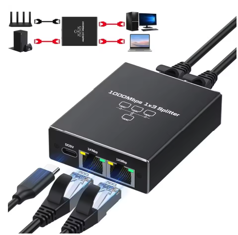 splitter switcher 1000mbps μικρο πρακτικο με τροφοδοσια usb σας λυνει τα χερια για ευκολή εγκατασταση εως 3 συσκευων που χρειαζονται internet στον ιδιο χωρο με ενα καλωδιο